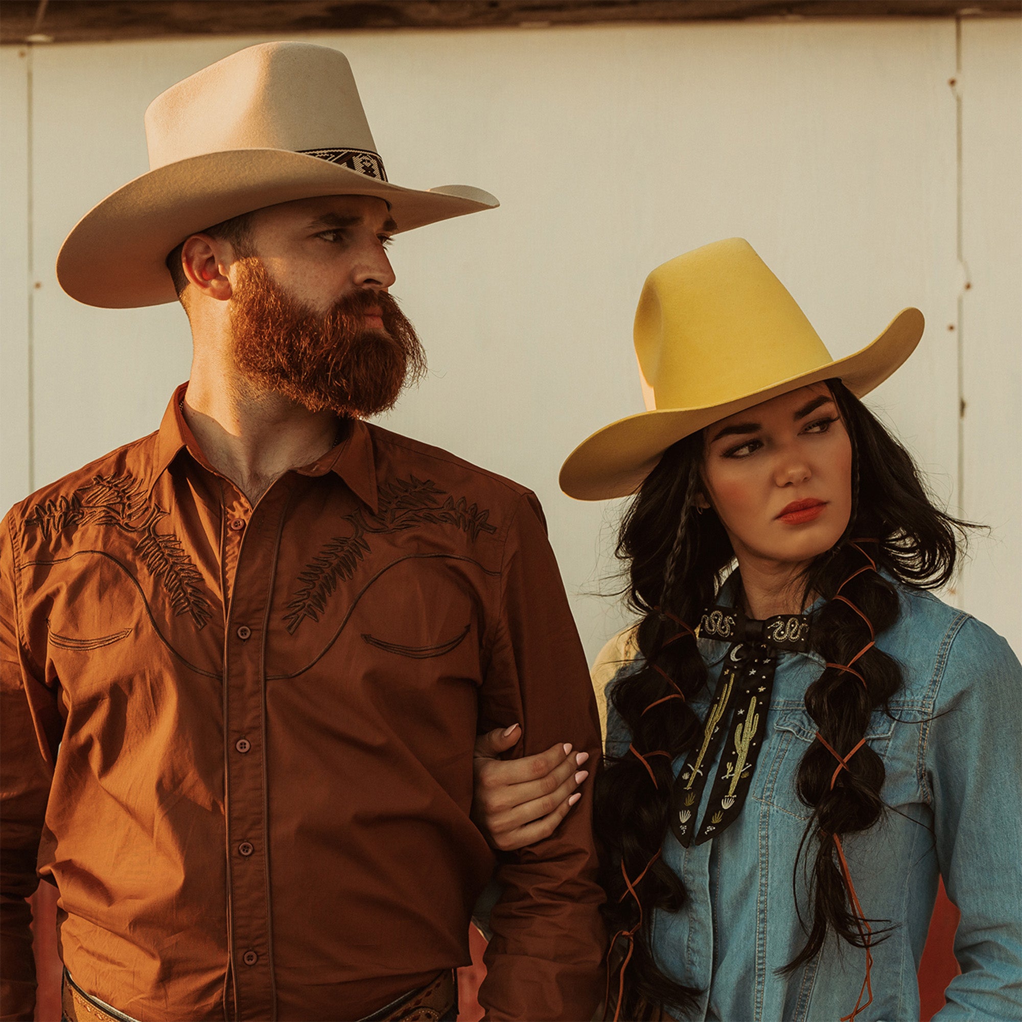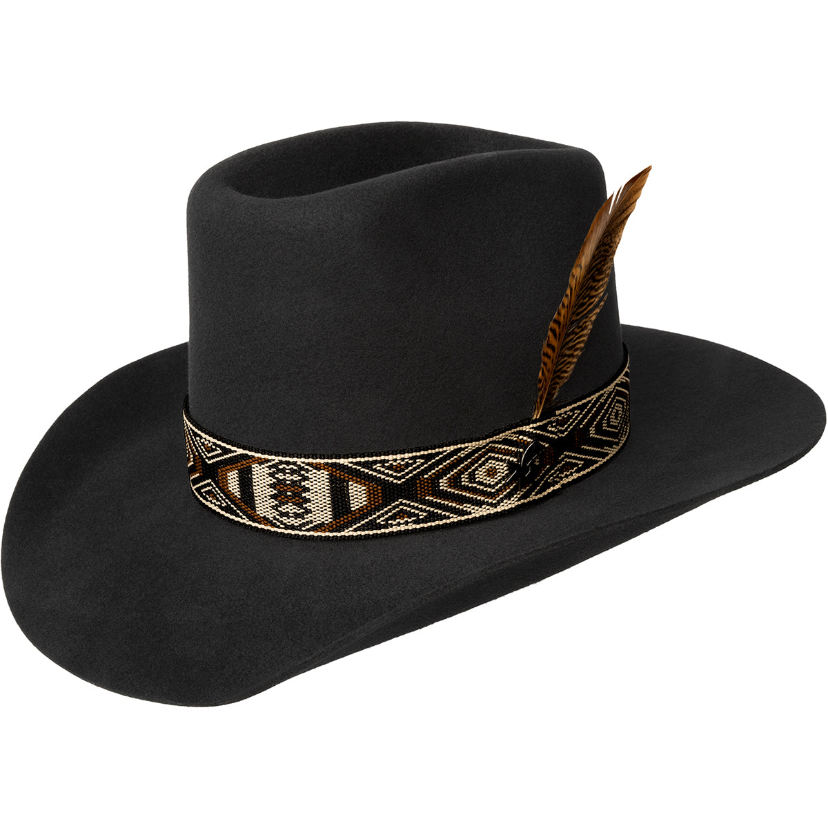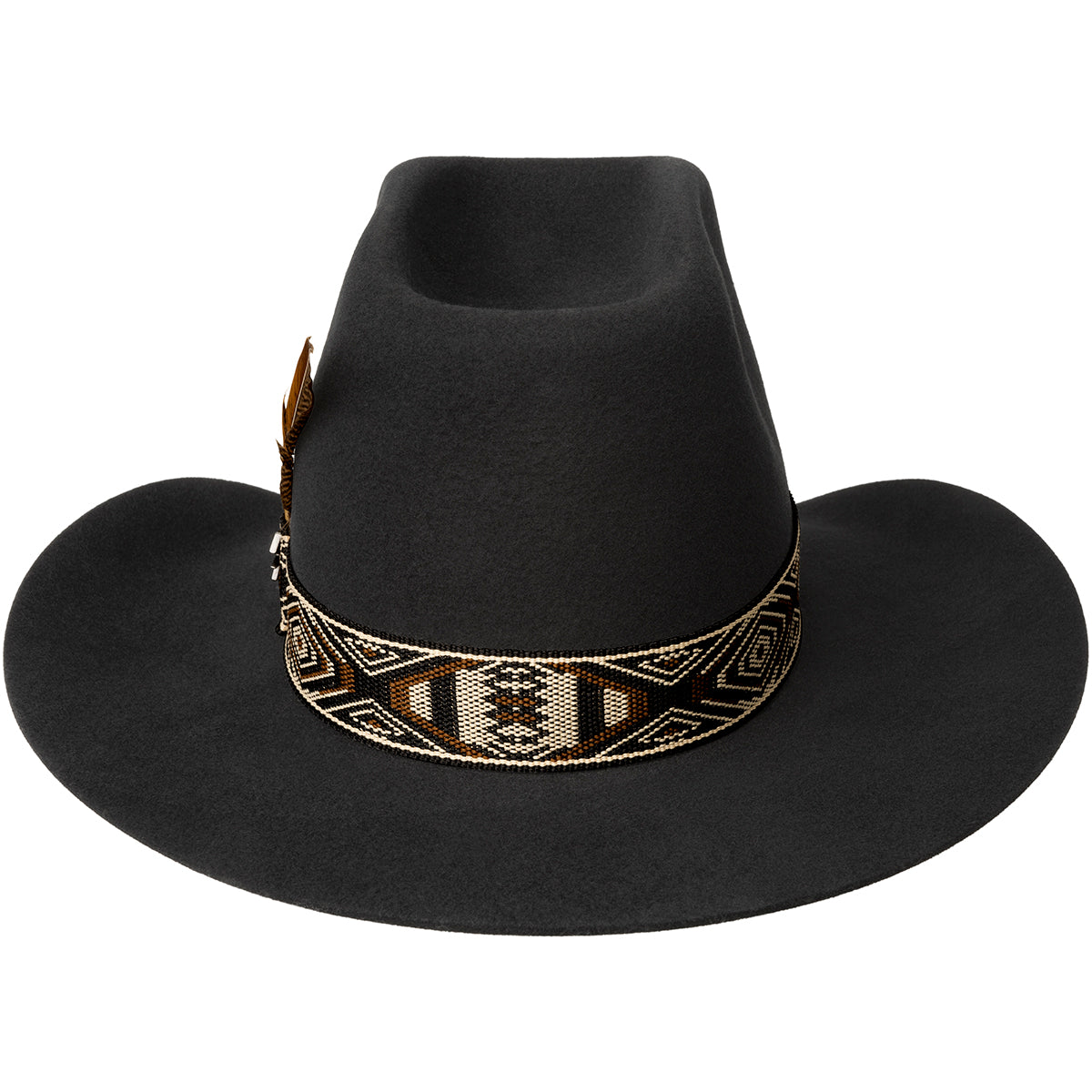 Nu Aztec has a Tall Brick crown and a 3 3/4" brim and is trimmed with an Aztec woven band and removable feather. Fully lined, it sports a leather sweatband.