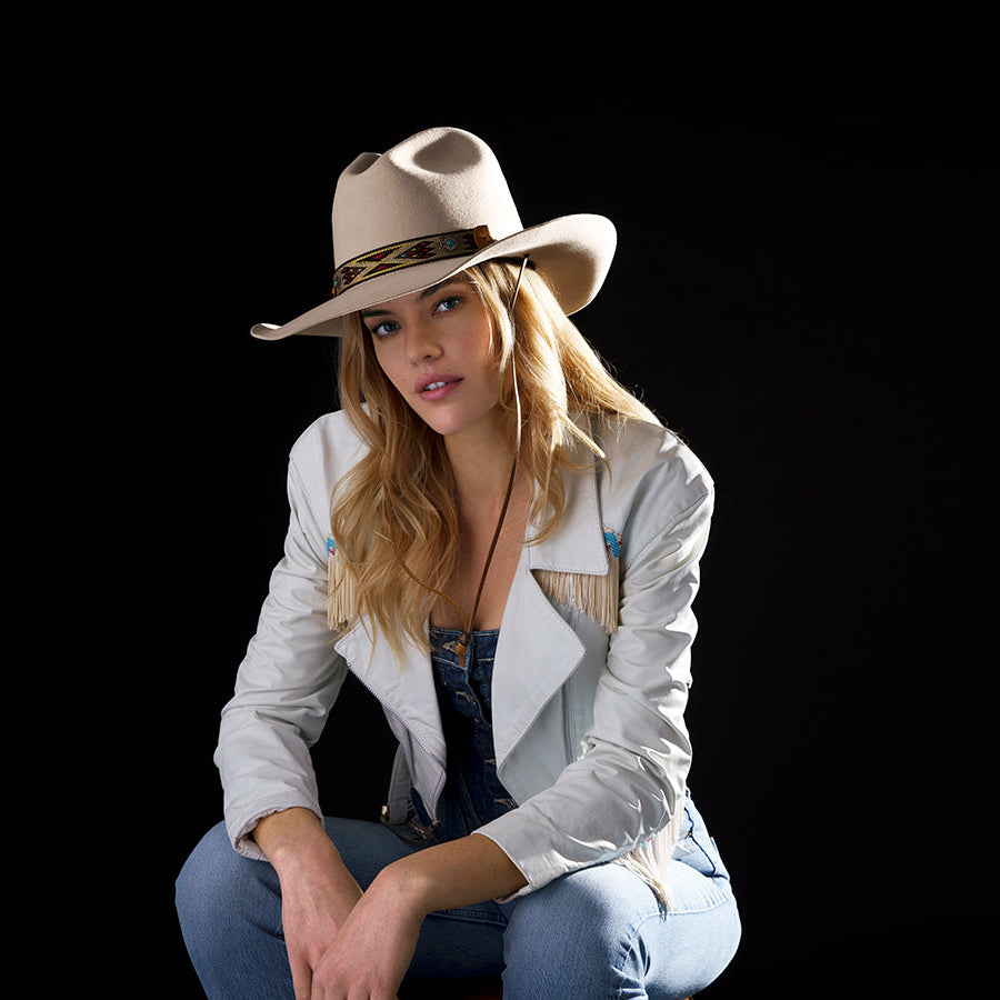 The Hickstead is a gus crown with a 3 1/2" brim that comes in either a cranberry or mist color. The woven band material gives a Southwest feel to the hat, and the conchos and genuine leather chincord straps are great additional features.